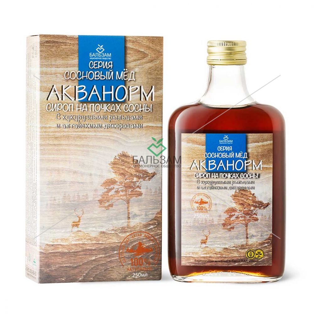 Сосновые почки, собранные в период наибольшей активности, - это кладовая ценных биологических веществ, витаминов и микроэлементов, обладающих широким спектром оздоровительного действия. Полезные свойства сосновых почек целенаправленно усилены специально подобранными и введенными в состав лекарственными травами Алтая. Направленность действия сиропа обусловлена его ингредиентным составом и свойствами биологически активных веществ лекарственных растений. Противовоспалительную и антисептическую активность в отношении слизистой мочевыделительной системы обеспечивают дубильные вещества, эфирные масла и флавоноиды, содержащиеся в сосновых почках, мяте, кукурузных рыльцах, горце птичьем, бруснике, крапиве. Арбутин, входящий в состав брусники, совместно с биологически активными веществами горца птичьего и сосновых почек, обладает выраженным мочегонным эффектом, способствует улучшению мочеотделения, снятию отеков, оказывает желчегонное действие. Биоактивные вещества одуванчика, крапивы, брусники, сосновых почек, антрахиноны, содержащиеся в листьях сенны, благотворно влияют на водно-солевой обмен, способствуют выведению вредных веществ из организма, тем самым препятствуют развитию мочекаменной болезни. Антрахиноны сенны оказывают легкое слабительное действие. Спазмолитическое и седативное действие сиропа обусловлено эфирными маслами и флавоноидами мяты, кукурузных рылец, брусники, горца птичьего. Флавоноиды, содержащиеся в большинстве лекарственных растений состава, комплекс витаминов шиповника, рябины обыкновенной, катехины и витамин С рябины черноплодной обладают капилляпротекторной активностью, замедляют процесс свободнорадикального окисления и обеспечивают антиоксидантную защиту организма. СОСНОВЫЙ МЕД «АКВАНОРМ»СИРОП нормализует мочевыделительную функцию, способствует уменьшению отечности, улучшает общее самочувствие и стабилизирует состояние людей, склонных к повышению артериального давления.